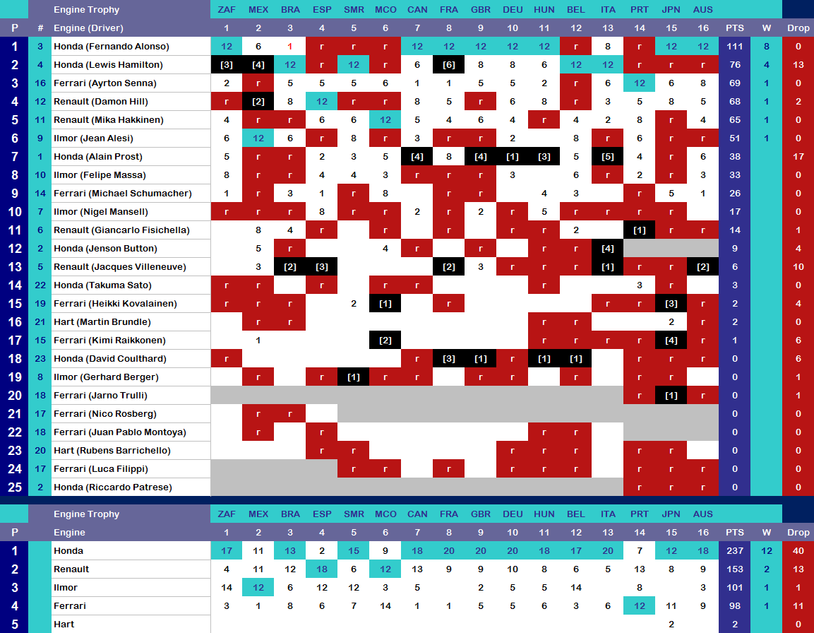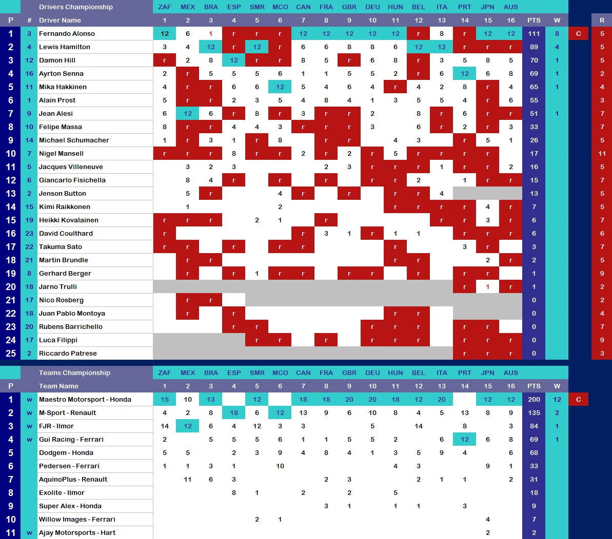 Both French drivers experienced contrasting fortunes in the race, as Jean Alesi suffered a retirement, while Alain Prost enjoyed a trouble-free race to finish 2nd, sandwiching the two Maestro drivers. It was Fernando Alonso who did indeed win his second French Grand Prix in a row, with his teammate Lewis Hamilton 3rd. The result put Maestro Motorsport in relatively firm control of both championships, and they looked hard to beat as well.
